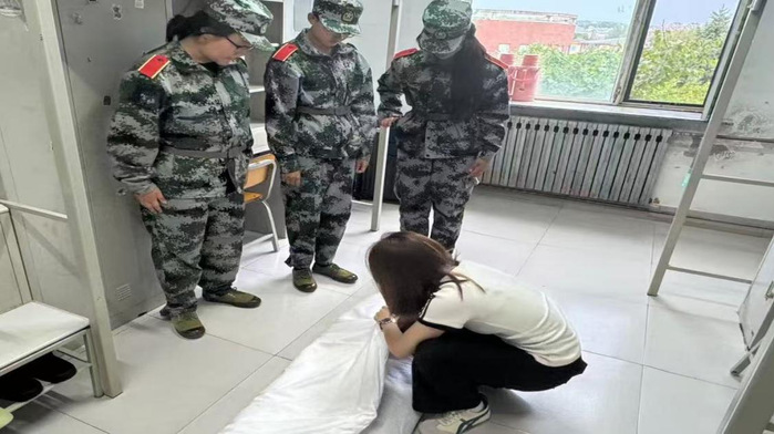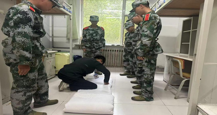内务整理作为新生适应大学生活的重要一课。学生志愿者一边指导新生叠军被技巧,一边强调内务规范的意义。“内务是大学生活的第一课,一折一压,皆成规矩;一抚一理,尽是温柔。” 周围的新生们认真观摩、积极尝试,志愿者还主动协助整理床铺,让宿舍环境在协作中变得整洁有序,也让新生在实践中感受到集体生活的温暖。