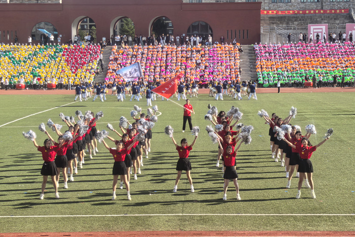 看台上,师生们情绪激昂,呐喊助威声此起彼伏。各学院啦啦队用跃动的身影和响彻全场的口号引爆热情,她们犹如跳动的音符,使热烈的气氛持续升温,感染着在场每一个人。