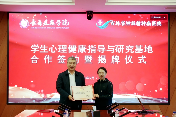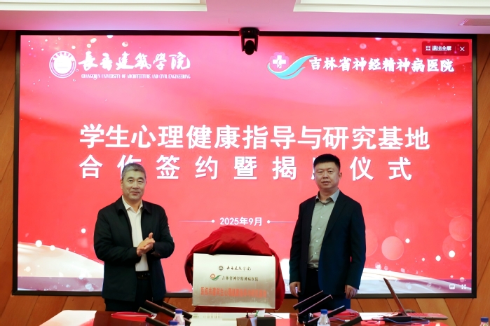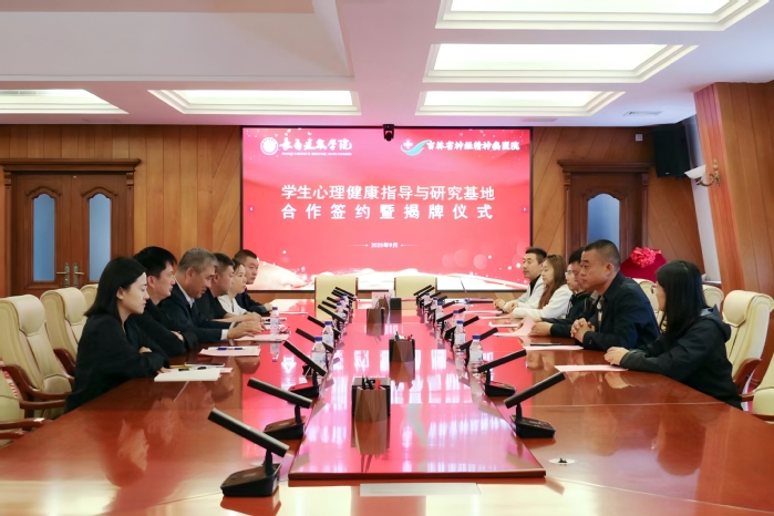 为贯彻落实教育部关于加强高校学生心理健康教育工作的相关要求,整合高校教育资源与医疗专业优势,构建“预防-筛查-干预-转介”的全链条心理健康服务模式,9月24日上午,学校与吉林省神经精神病医院“医校共建学生心理健康指导与研究基地”合作签约暨揭牌仪式在行政楼六楼会议室举行。
