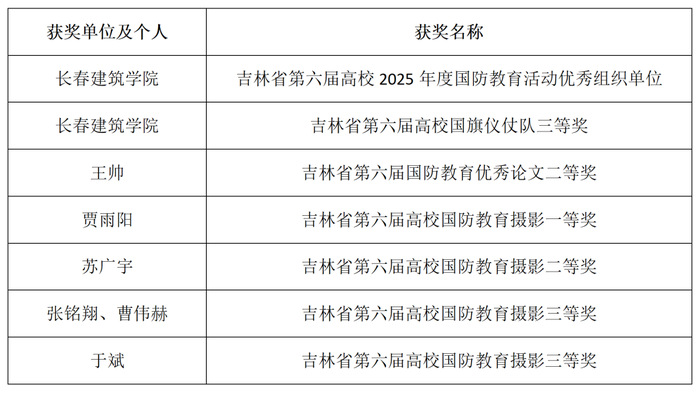 为深入推动我省高校国防教育工作,吉林省高等教育学会国防教育专业委员会精心组织开展了第六届吉林省军用枪射击比赛、国旗仪仗队展示、吉林省国防教育优秀论文评选及吉林省高校国防教育先进评选等系列活动。12月1日,吉林省高等教育学会国防教育专业委员会公布了《关于表彰吉林省高校国防教育先进单位和先进个人的决定》,学校在此次活动中荣获多项省级荣誉表彰: