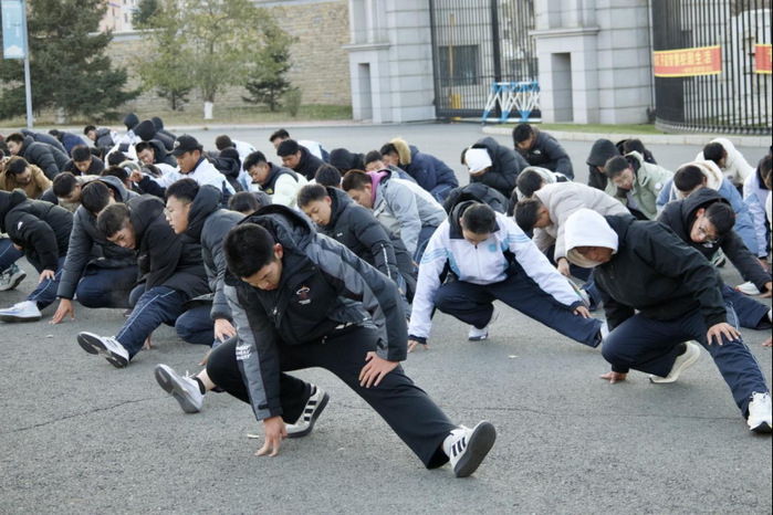 晨跑结束之后,训练旋即进入放松拉伸阶段。学员们遵循教官的节奏,竭力使拉伸达到理想效果。